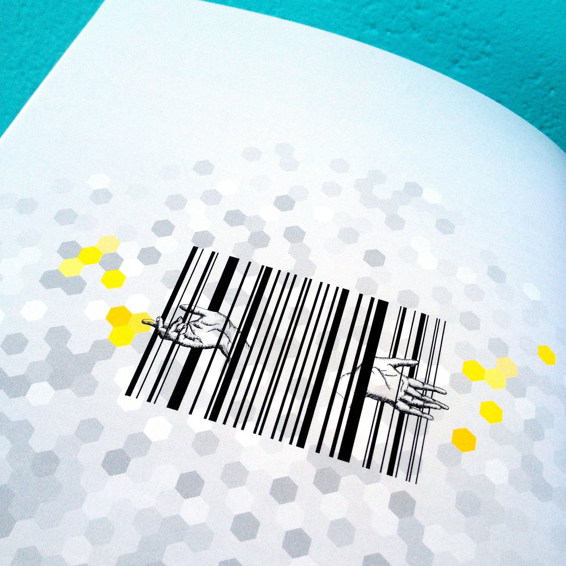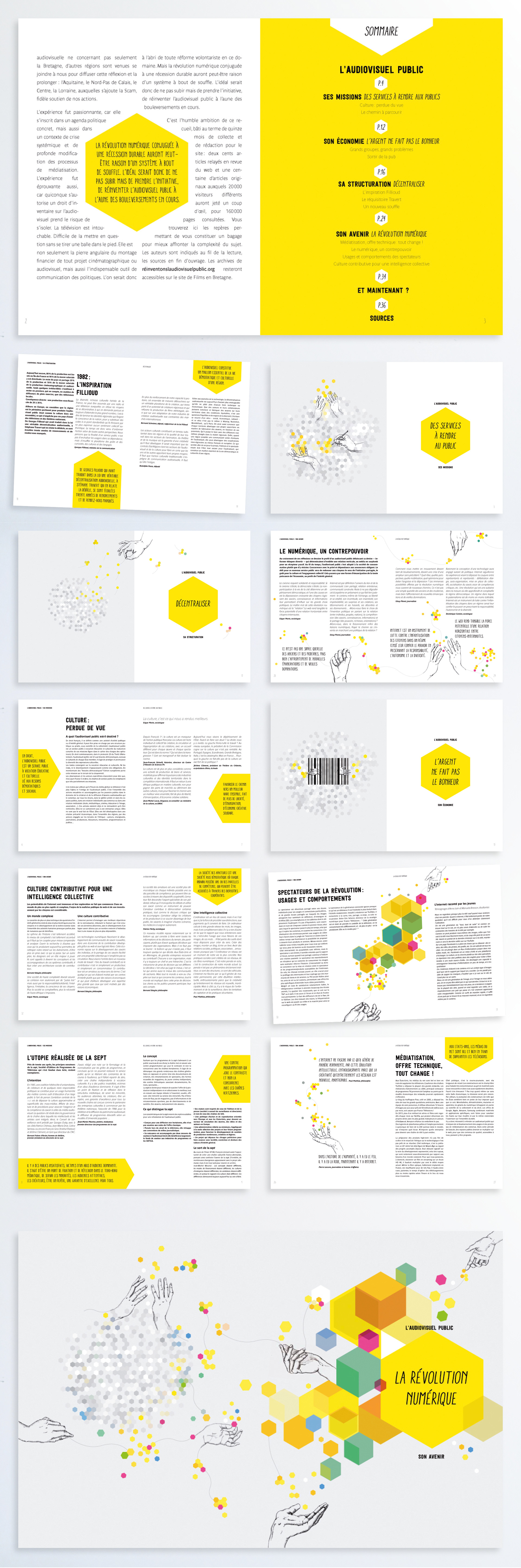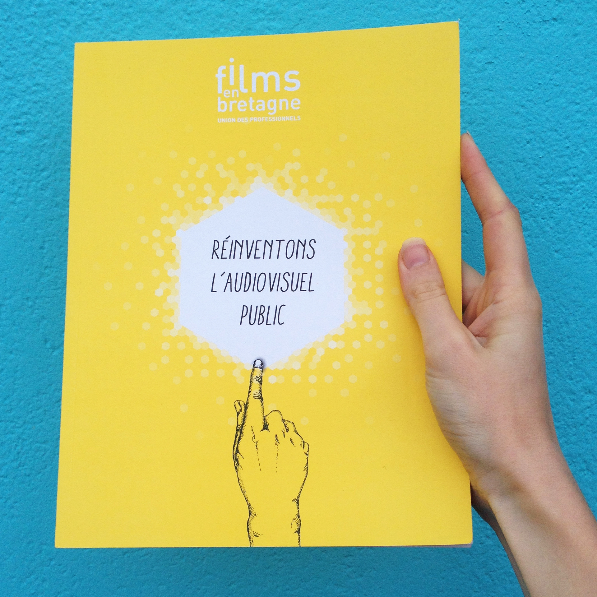 Création graphique, design éditorial et mise en page de la publication de Films en Bretagne "réinventons l'audiovisuel public". Illustration des mains : Amélie Gagnot